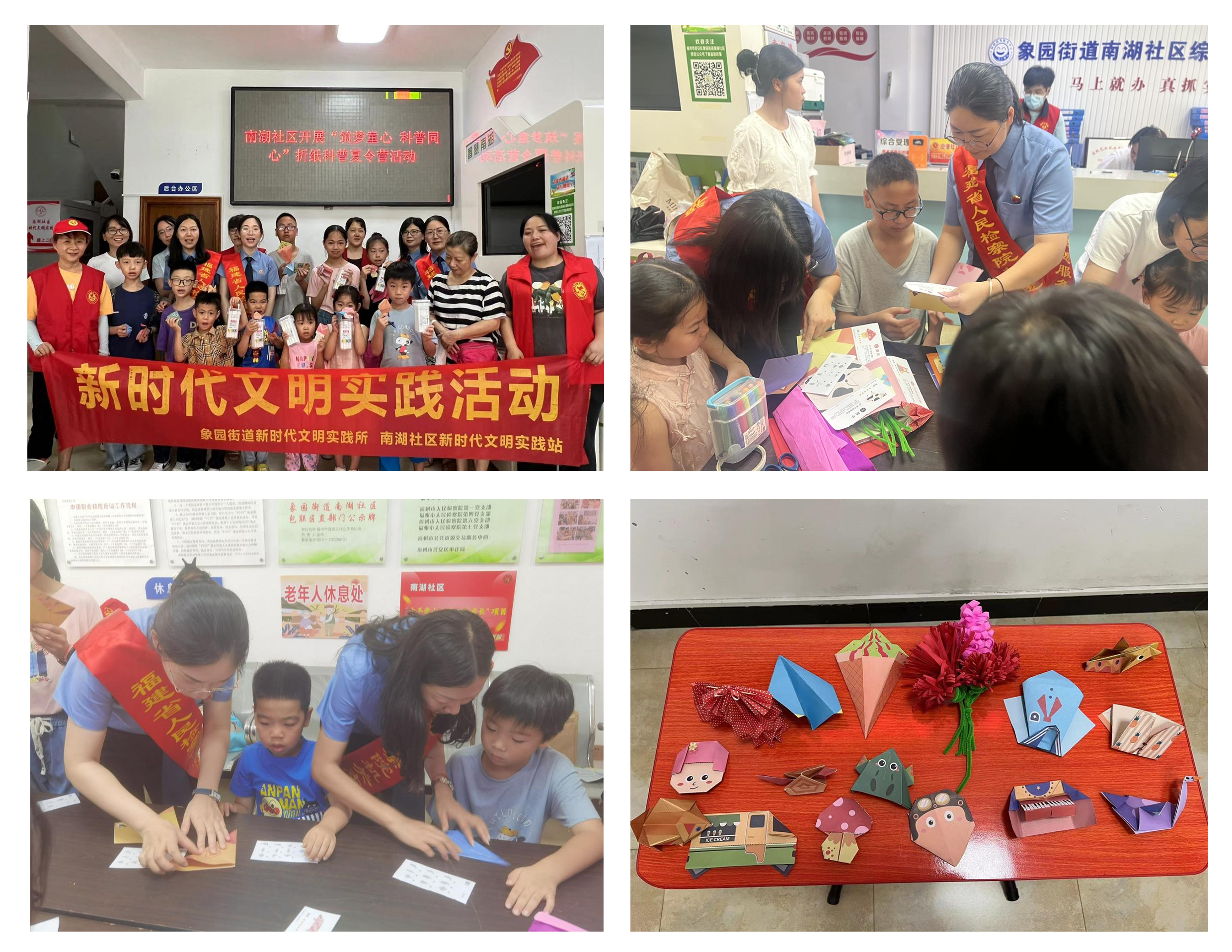 7月14日,依托社区新时代文明实践站,省检察院与象园街道南湖社区联合开展新时代文明实践,助力社区举办以“筑梦童心 科普同心”为主题的折纸科普夏令营活动。活动现场,在志愿者的陪同和帮助下,小朋友们根据自己的兴趣爱好,或认真进行手工DIY,或专心握笔画画,或组队比赛玩游戏,气氛一片欢乐和谐。省院志愿者们运用不同的专业知识和满怀的爱心和耐心,通过多层次、多内容、多形式的学习培训和教育活动,让孩子们在活动中不断成长,在活动中收获快乐,让童年辉映出别样的风采。活动的最后,志愿者们还为小朋友送上了精心准备的礼物。此次活动为社区少年儿童的暑期生活增添了科技色彩,促进了中小学生全面健康发展和科学素养提升,进一步推动了新时代文明实践深入人心。